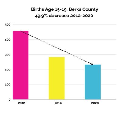 READING, PA – June 2022 The Pennsylvania Department of Health recently released 2020 birth data for the state. In Berks County, the data showed teen births (ages 15-19) dropped by 49% since 2012. Birthrates in the City of Reading decreased by 44% in the same timeframe.